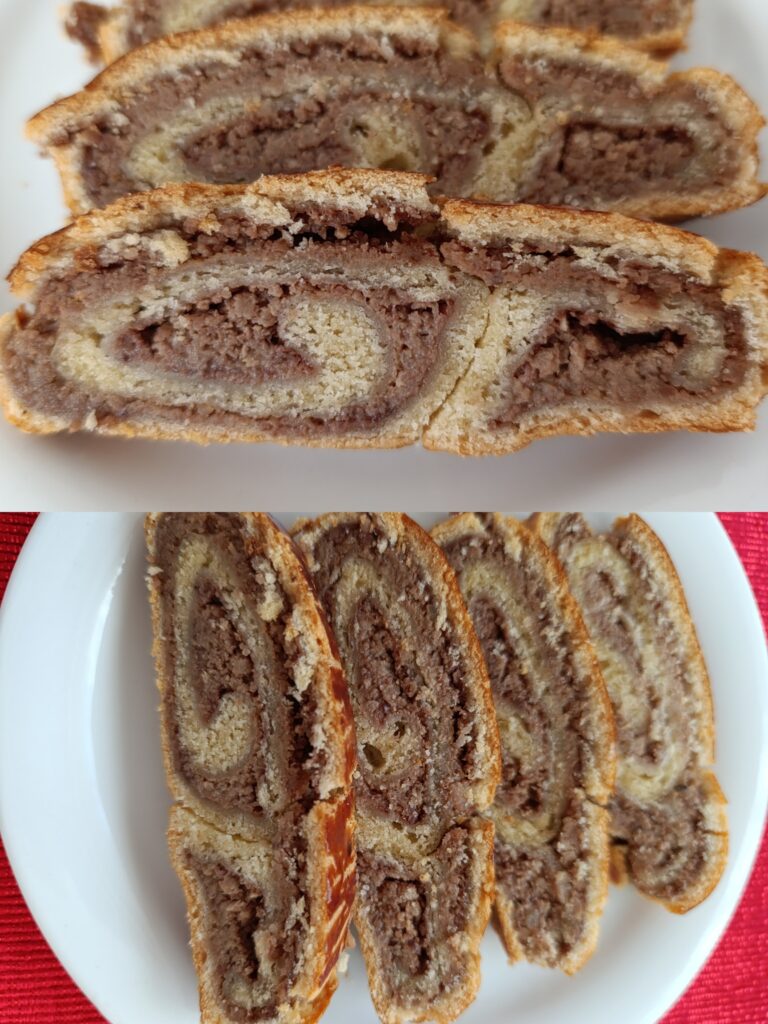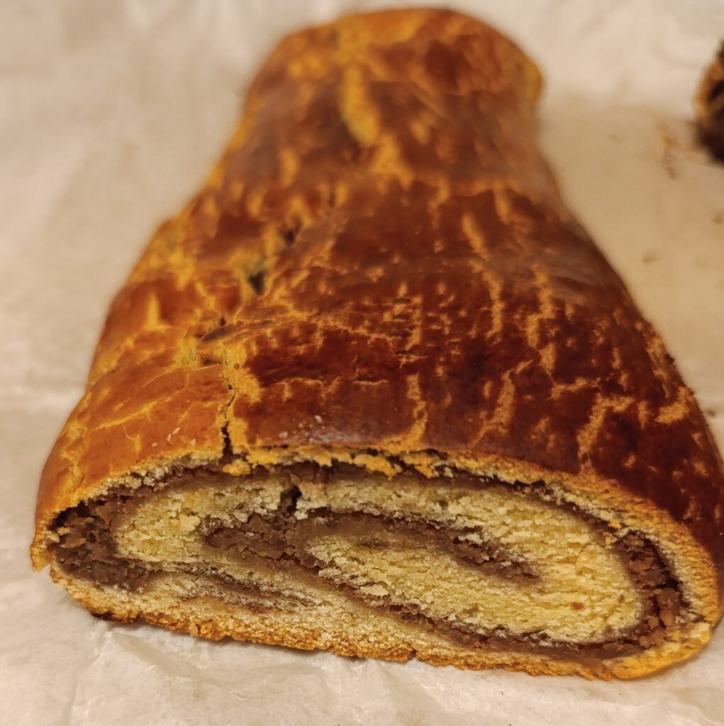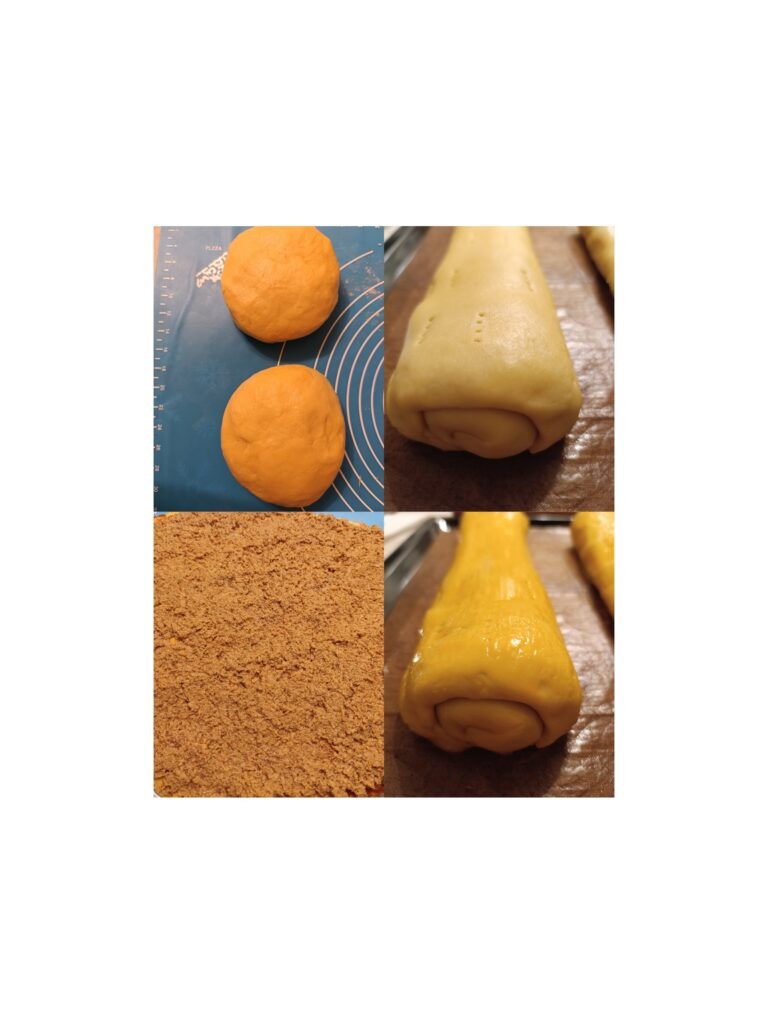 A tésztát két cipóra szedjük. Kinyújtjuk, ízlés szerint vékonyan meg lehet kenni lekvárral és megtöltjük a töltelékekkel. A széleket behajtom kb ujjnyi vastagon, és elkezdem feltekerni. Amikor kész megszurkálom, és lekenem tojás sárgájával. Hagyom dermedni kb 20 percet.