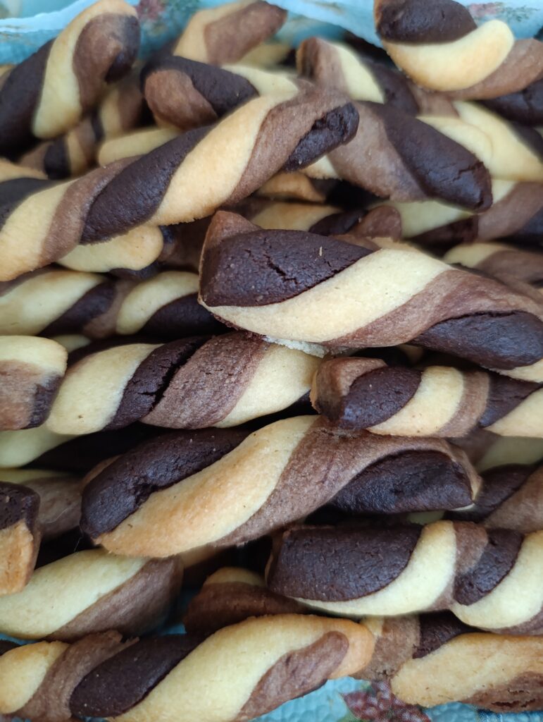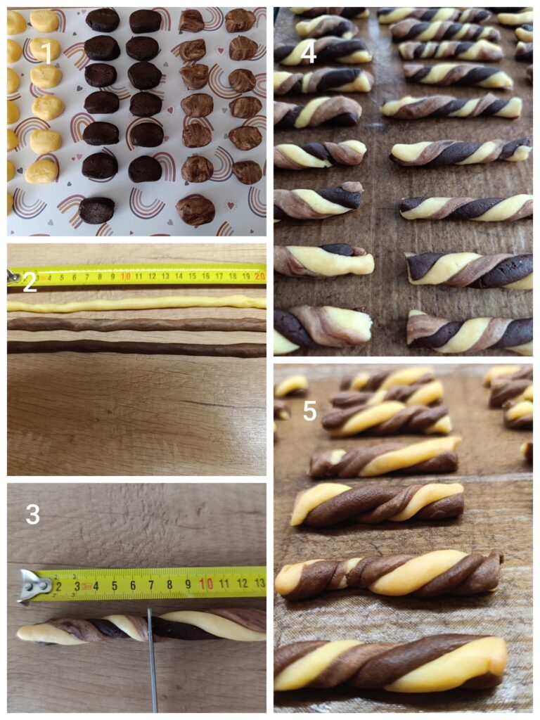 A cukrot, vajat, sót összekeverjük robotgéppel, majd a lisztet hozzáadva egyneműsítjük kézzel. A keksz tésztát három részre osztjuk. Az egyik cipóhoz 1tk kakaóport teszünk és összegyúrjuk vele. A másikhoz 6tk kakaóport és 1tk fahéjat adunk, és összedolgozzuk. A harmadik tésztához nem adunk semmit.