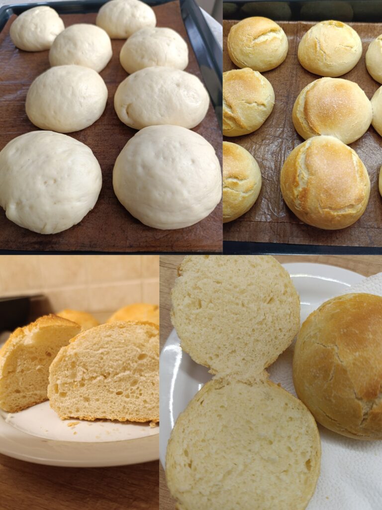Ezután tíz darab bucira szedjük a tésztát, és zsemleformákat gyúrunk belőlük. kb80-85g/db. Sütőpapíros tepsire helyezzük, és megkenjük a tetejüket olajos kézzel hogy kelesztés közben ne száradjanak ki.