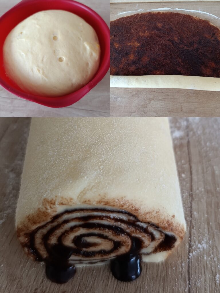 Ezután lisztezett felületen kinyújtjuk a tésztát kb fél cm vastagra. Megkenhetjük olvasztott margarinnal, vagy spricnivel lefújjuk vízzel. Majd rászórjuk a cukros kakaót, és az ujjunkkal elegyengethetjük, hogy mindenhova jusson. Kicsit lefújhatjuk még vízzel, vagy meglocsoljuk olvasztott margarinnal, hogy ne peregjen a töltelék. Lassan egyenletesen feltekerjük a tésztát. Ujjnyi vastagra felvágjuk, és sütőpapíros tepsibe helyezzük. Magasabb lesz ha nem nyomkodjuk meg a tésztát, ki hogy szereti.